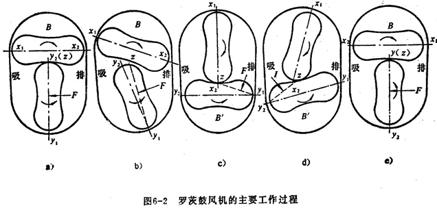羅茨鼓風(fēng)機(jī)系屬容積回轉(zhuǎn)鼓風(fēng)機(jī),其按轉(zhuǎn)子的形狀可分為兩葉型和三葉型。三葉型轉(zhuǎn)子每轉(zhuǎn)動(dòng)一次由 兩 個(gè)轉(zhuǎn)子進(jìn)行三 次吸、排氣。與二葉型相比,氣體脈動(dòng)性小,振動(dòng)也小,噪聲低.不問(wèn)主要介紹一下二葉羅茨風(fēng)機(jī)的工作原理。